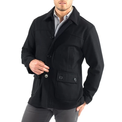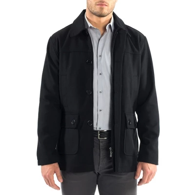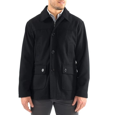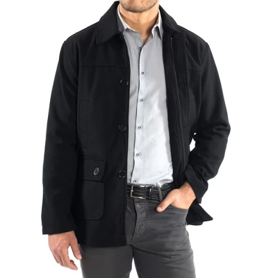 Wyatt Classic Wool Barn CoatBy Alpine Swiss The new Wyatt barn coat is rugged and practical with four front pockets and a button up and zipper closure. Wool Blends – 30% wool, 70% polyesterZip up closure with a button closure placket over the zipperTwo front flap pockets with button closure Two front veritcal chest welt pocketsInside zipper closure chest pocketFully lined satin interior with no fill for a lighter weight coatFit is true to sizeMSRP $185.00