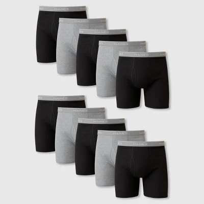 This Hanes Super Value pack includes ten pairs of men’s boxer briefs crafted from soft and breathable cotton for everyday comfort (heathered styles are a cotton-rich blend). You’ll stay cool thanks to moisture-wicking Cool Comfort® fabric that helps keep you comfortable – no matter how long your day. You’ll also appreciate the no-ride-up fit, Tagless® interior, and a Comfort Flex® waistband that stretches and moves when you do. Stock up with this multi-pack of men’s boxer briefs in black and grey so you can always keep a clean pair of Hanes underwear on hand.