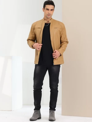 - Faux leather fabric, stand collar, multiple pockets, motorcycle jacket.