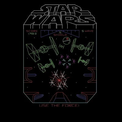 Use the Force and set a new high score with the Star Wars Arcade Game Black T-Shirt. This black graphic tee features a colorful print in the style of the classic Star Wars arcade game so you can take on the Empire every day of the week.