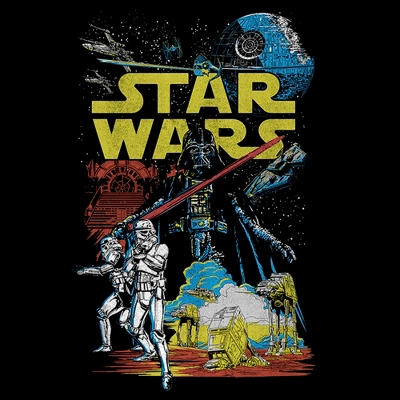 Feel like you are right in the middle of a Galactic battle with the during Star Wars Galactic Battle style. Darth Vader, AT-ATs, and stormtroopers are printed in an epic vintage style on this retro Star Wars shirt.