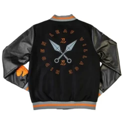 Unleash your inner ninja spirit with this men’s black Naruto varsity jacket. Its striking design features vibrant orange numbers 01, 06, and 07, adorned with shurikens and kanji letters. The Hidden Leaf Village emblem on the lapel adds an authentic touch. The gray sleeves and collar, accented by orange trim, exude style. Crafted from a blend of cotton, polyester, wool, and spandex, this jacket promises both comfort and durability. The snap front and two snap pockets offer practicality while maintaining a sleek look.