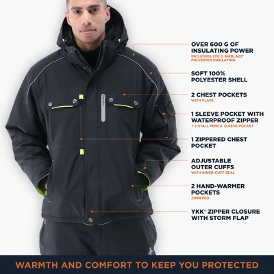 - POCKET STORAGE SPACE: With 2 zippered insulated front pockets, 2 chest-flap pockets, 1 zippered chest pocket, 1 zippered left-sleeve pocket, 1 zippered inside pocket, and a 1-stall pencil pocket on the left sleeve, this rugged outerwear has plenty of space for your hands and small tools.