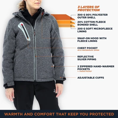 The Women’s Fleece-Lined Extreme Sweater Jacket is what you need to work in extreme winter climates. Whether you’re outdoors in negative temperatures or dealing with industrial freezer machines, this cold-weather hooded women’s jacket provides you with protection and warmth in any frigid environment, and the removable hood can be snapped on for added head protection. Each hooded thermal jacket is insulated with 300 g of 80% polyester and 20% cotton fleece to create a 3-layer bonded outer shell for maximum heat-trapping capabilities.